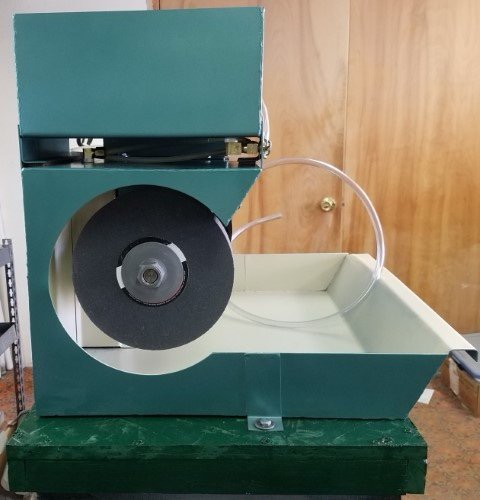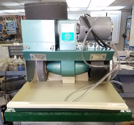 Here’s the details: Completely disassembled, stripped, painted, set on a super heavy duty base with the original 1/3 HP motor, NEW 100 grit silicon carbide wheel, NEW Expando-type sanding drum, NEWE 8″ screw-on convex foam polishing head with a leather cover, new drain hose, on a heavy duty base. There is space for another polishing or sanding head on the left side. Self-contained water drip system with independent valves. 8 silicon carbide belts for the drum sander to get you started (2 each of 220, 400, 600, 800 grit). Unscrew the polishing head when you’re sanding and screw it in to polish with oxide polishing compound. The 2 side shields clip on when you’re not using the polishing heads. You can change the drum belts without removing anything