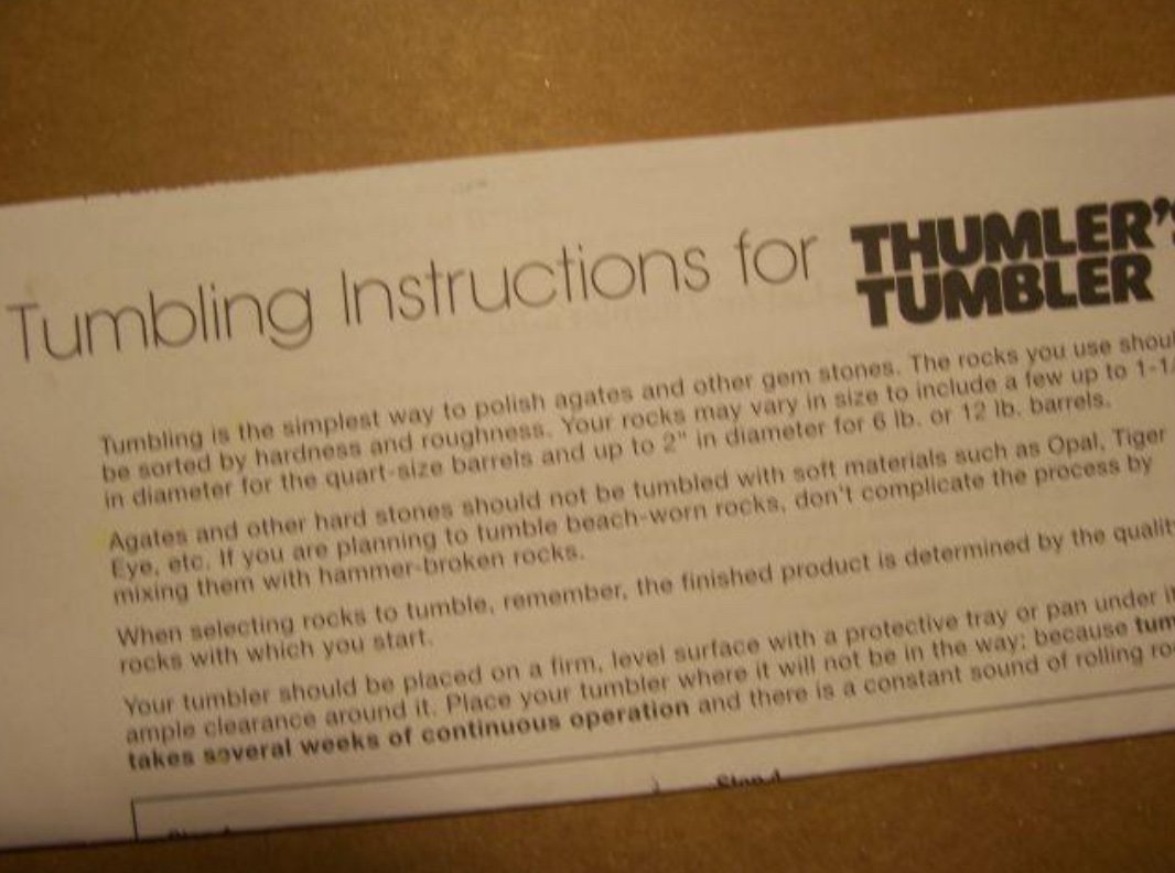 Up for sale is this “Original” THUMLER’S TUMBLER-ROCK POLISHER. It is the Model T, Stock # 100. This unit is Bran-New, and has ” never been used”. It comes complete with: A 1-Qt. Rubber Tumbling Barrel, hard plastic lid, and rubber retaining O-ring.—A Guide For Rock Polishers;– Tumbling and Safety Instructions pages;– TRU-SQUARE METAL PRODUCT-Number Sheet and order form. It has a 120v 60Hz Electric Motor